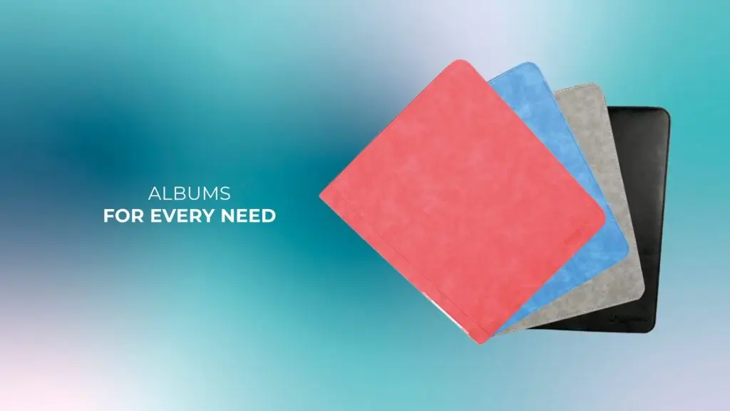 Albums segmentés par type et taille de cartes, avec finitions premium.